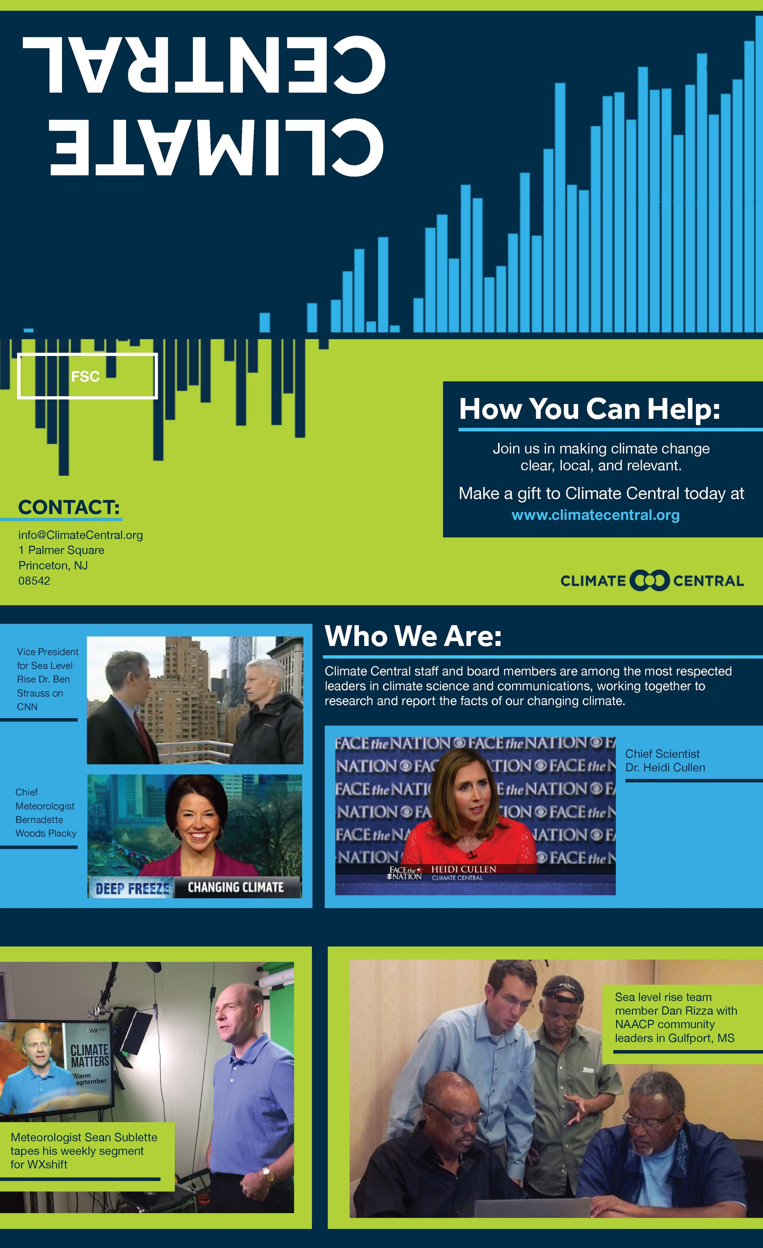 This brochure was printed and distributed at COP 21 (Conference of the Parties). It describes the various programs at Climate Central and was used to capture potential donors and clients. It was created in InDesign.